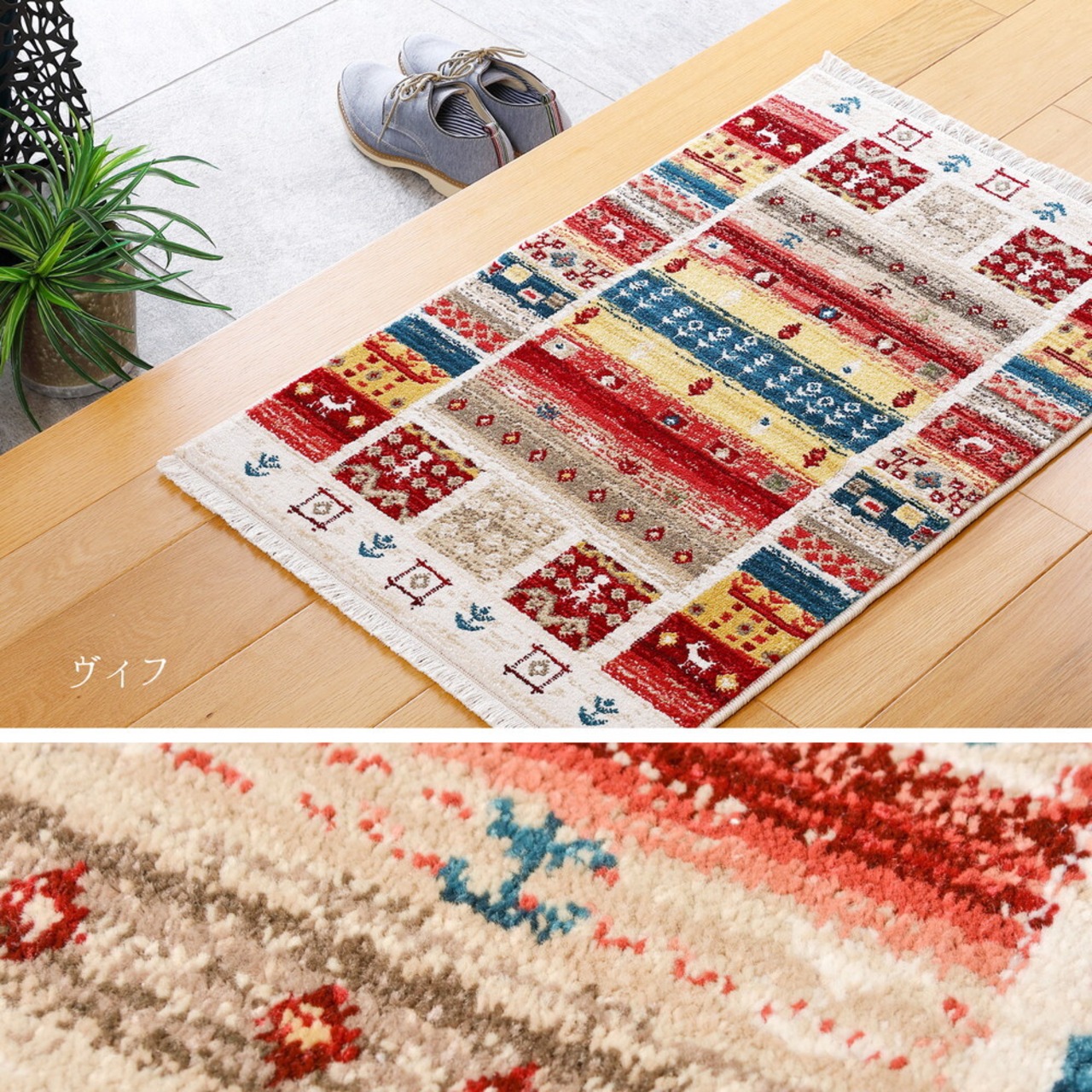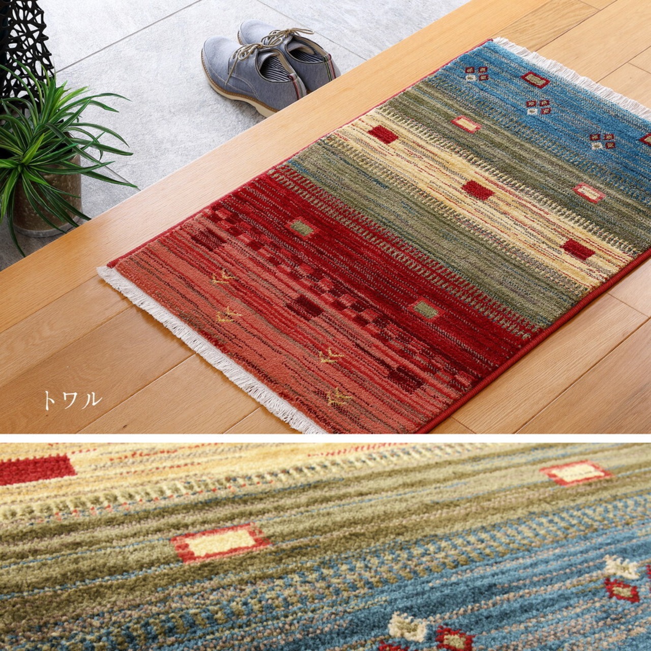 ラグの名産地トルコ製のウィルトンマット。民族調手織り絨毯の様なエスニックなデザインをウィルトン織機で織り上げました。毛足は1cm程ありますが密度が高く、掃除機もかけやすいようデザインされています。縦糸の特殊加工により生地がやわらかく、折りたたんで収納出来ます。
