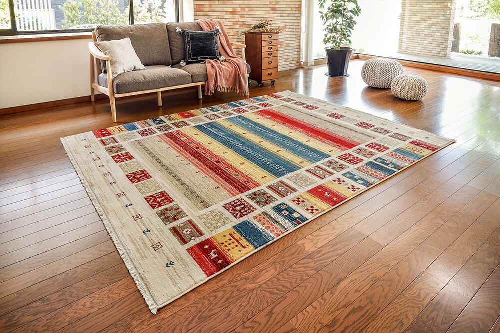 ラグの名産地トルコ製のウィルトンラグ。民族調手織り絨毯の様なエスニックなデザインをウィルトン織機で織り上げました。毛足は1cm程ありますが密度が高く、掃除機もかけやすいようデザインされています。縦糸の特殊加工により生地がやわらかく、折りたたんで収納出来ます。