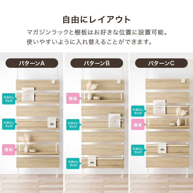 本の表紙をディスプレイできるマガジンラック付きの突っ張り式収納です。棚やフックも付いているのでお好みのレイアウトで使用可能。
