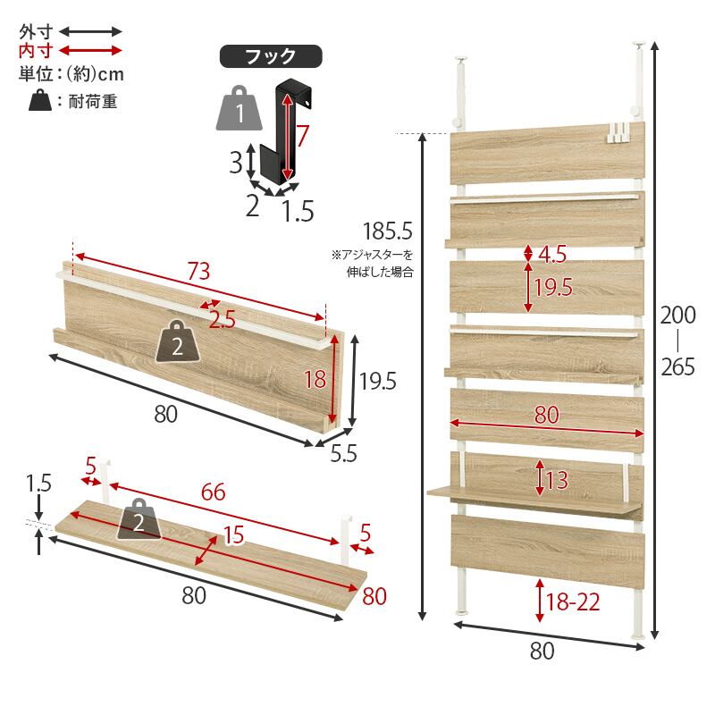 サイズ:(約)幅80×奥行21.5×高さ200~265cm