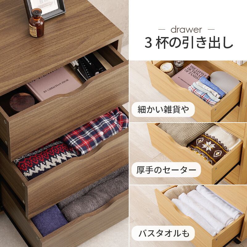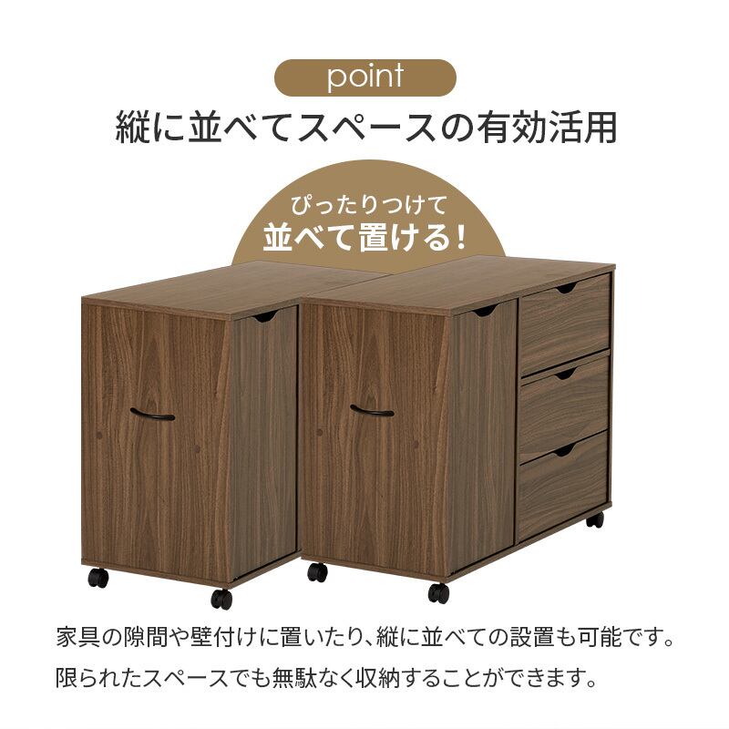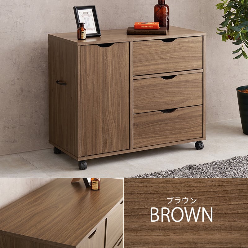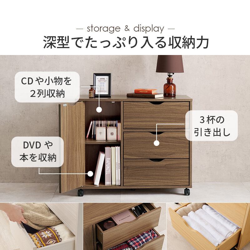 スッキリとしたデザインで移動に便利なキャスター付き。たっぷり収納できる引き出しと出し入れしやすい扉収納タイプ。